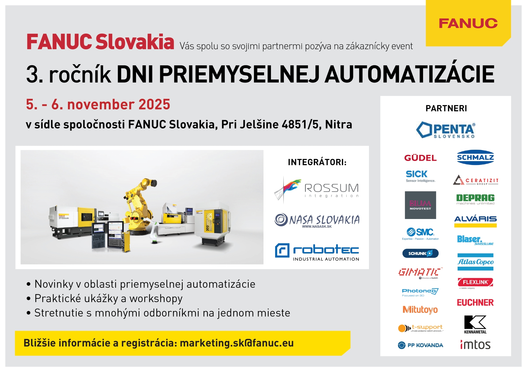 Společně s FANUC Slovakia vás zveme na 3. ročník Dnů průmyslové automatizace. Jako partner akce budeme po oba dny na místě.