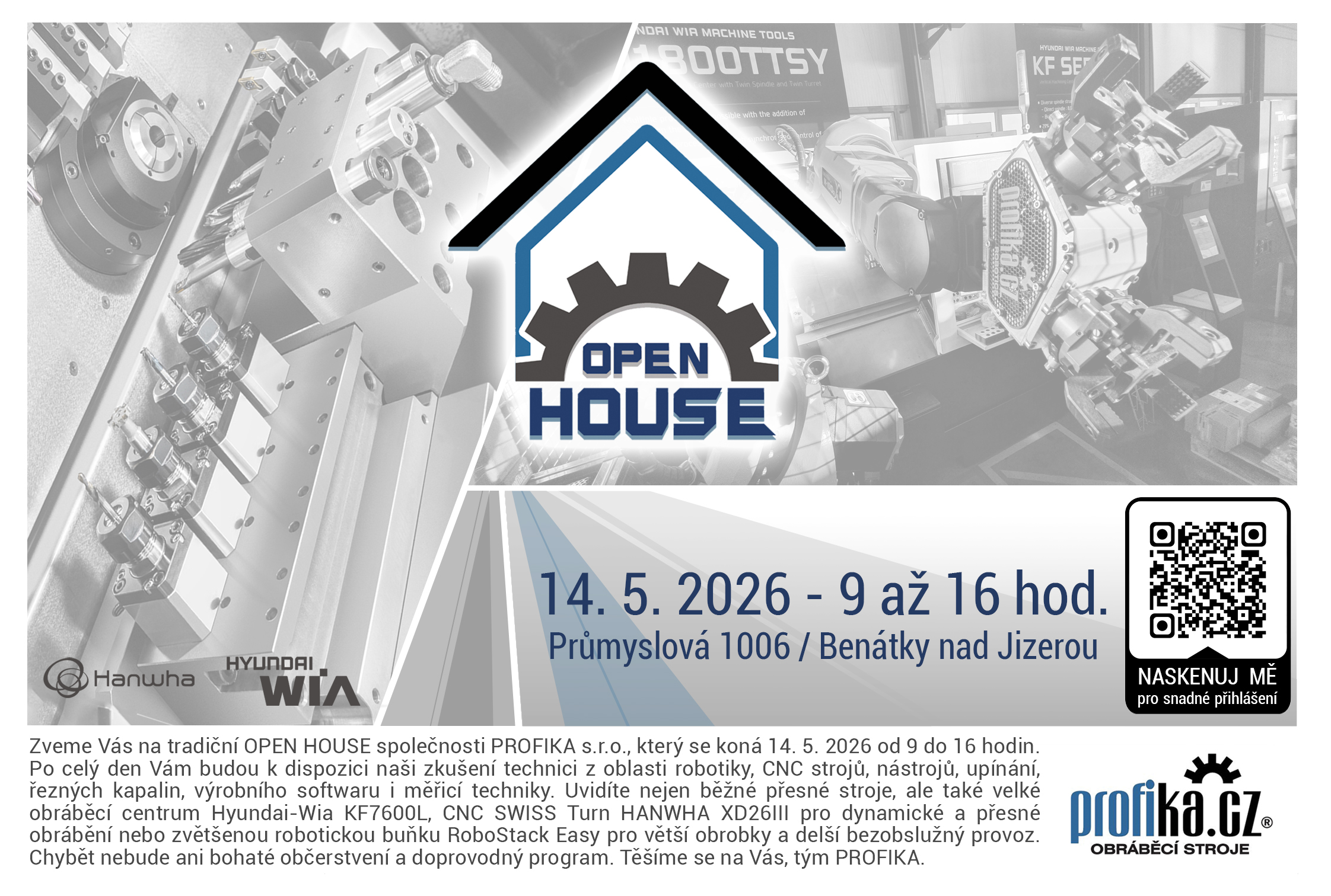 PROFIKA OPEN HOUSE 202614. 5. 2026 | Benátky nad Jizerou Zveme vás na náš tradiční PROFIKA OPEN HOUSE 2026, který se bude konat 14. 5. 2026 od 9 do 16 hodin.